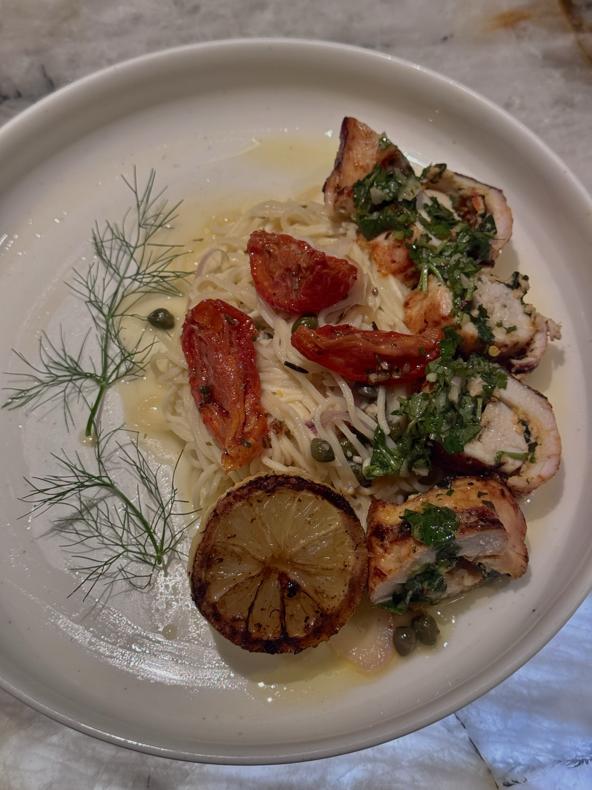 stuffed with goat cheese and basil, pasta piccata, and conserved tomatoes $26